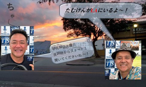 PODCAST(聞き逃し配信はPodcast でお聴きください)  Present(プレゼント当選者の発表です) TJS ラジオ 夜の番組、「たむけんが LA にいるよ~!」毎週火曜日午後 8 時から ~の生放送たむらけんじがお届けする「たむけんが LA にいるよ~!」楽しいトークバラエティ番組。「LA イベント」「政治ネタ」「時事ネタ」など話題満載。また音楽は たむけんが セレクトした 80 年代、90 年代の邦楽・洋楽を中心にお届けします。     毎週火曜日夜 8 時は TJS ラジオで盛り上がろ〜 ゲストと Podcast のリスト TJSラジオでは、LA時間の火曜日20時~(再放送を土曜日20時~)にて放送いたします! 出演:   たむらけんじ    VJ-サム ↓↓↓↓↓ラジオはここから聞いてね↓↓↓↓↓ 12月9日 (火) のゲスト・パートナーは…….. 本多屋の社長椋本 脩太郎さんをお呼びいたしました。 お楽しみに〜!   12/9(火)夜8時~9時(ロス生放送)・12/10(水)午後13時~午後14時(日本生放送)12/14(日)昼12時~13時(日本再放送)・12/16(火)昼13時~午後14時(日本再放送)     12/9 (火)のメッセージテーマは         『サンタにもらいたいもの』 僕にたくさんのメッセージください〜! スマホは、超簡単!! Android、iOS(iPhone)ともにTJSオリジナルアプリを無料でご提供しています。検索は、「TJS radio」と AndroidはGoogle Playで、iOSはAppstoreで入力!! 面倒な方は、以下をクリック!   この番組は 各スポンサー様のご支援により 放送が可能でございます。         #TamukenLA#たむけんLA     Instagram Archive  VJ-Sam Insta-CAMTJS-Studio Insta-CAM   YouTube PlayList 嬉しいお知らせです〜!    疲労やストレスでお疲れのみなさーん!ヒデ指圧の本格マッサージでリフレッシュしませんか? 肩や首のコリ、背中のはりや、足のむくみでお困りの方や、日々のストレスでお疲れの方、ぜひヒデ指圧で癒されてください。 今ならプロモーションコード『TJSRADIO』を使って60分以上予約すると、なんと10ドルオフ! ガーデナ、トーランスの2店舗でお待ちしています!             TJS Original Podcasts    Updated on December 9, 2025